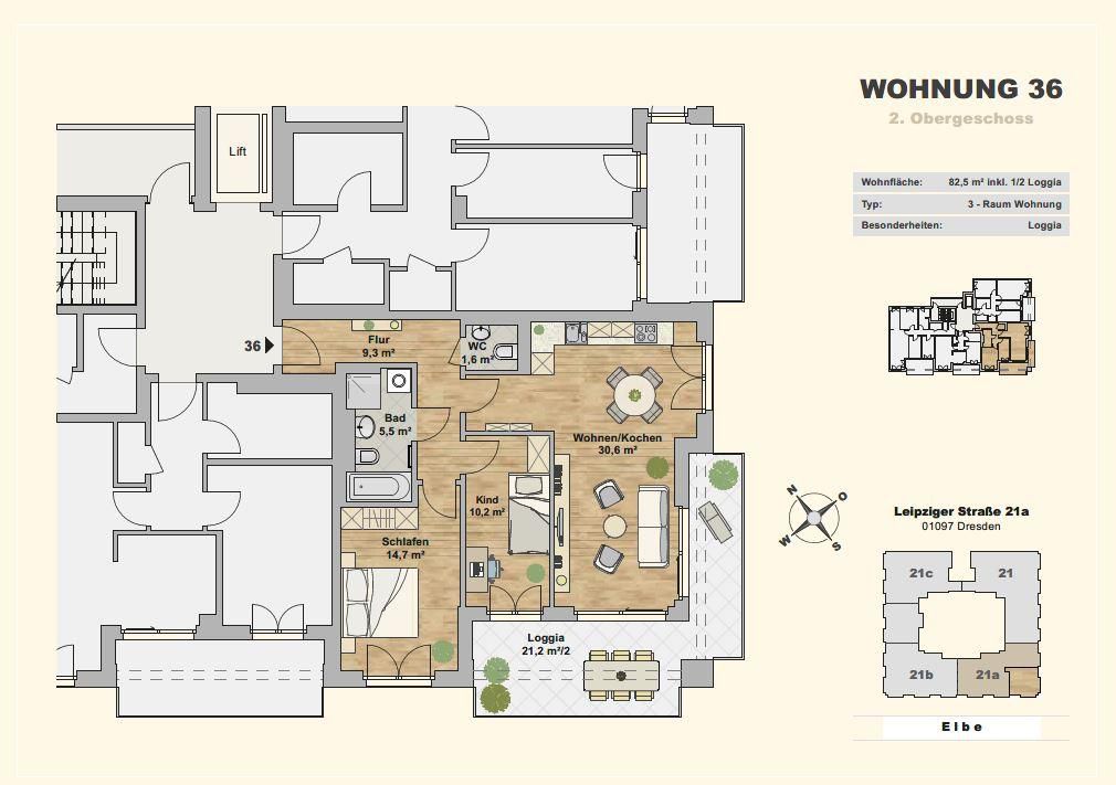 Die stilvollen Wohneinheiten haben eine Fläche von ca. 31 m² bis ca. 123 m² und besitzen einen teils unverbauten Blick auf die Elbe und den Neustädter Hafen. Hochwertige Materialien, durchdachte Grundrisse und Balkone oder Loggien an allen Wohnungen bieten eine Atmosphäre die zum Verweilen einlädt.