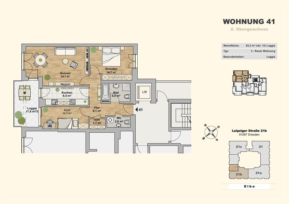 Die stilvollen Wohneinheiten haben eine Fläche von ca. 31 m² bis ca. 123 m² und besitzen einen teils unverbauten Blick auf die Elbe und den Neustädter Hafen. Hochwertige Materialien, durchdachte Grundrisse und Balkone oder Loggien an allen Wohnungen bieten eine Atmosphäre die zum Verweilen einlädt.