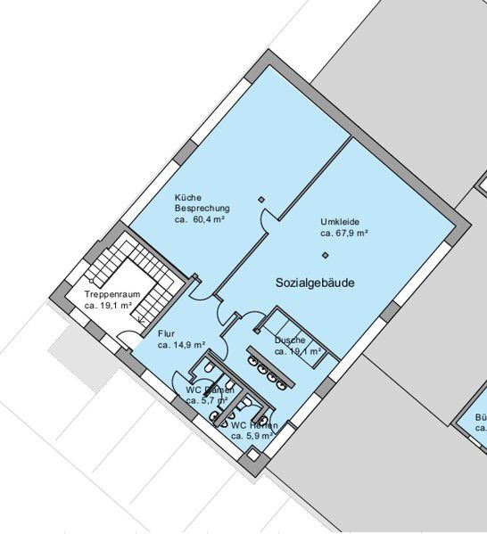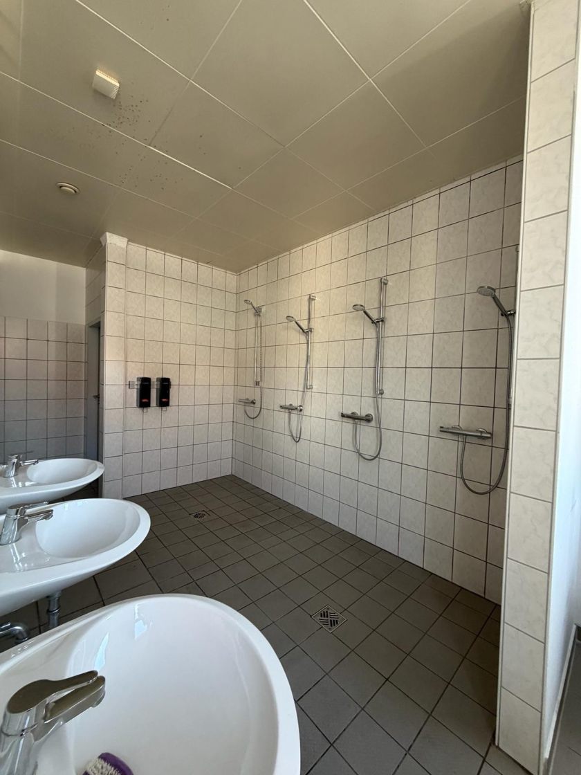 Es befinden sich bereits Toiletten, Duschen sowie eine geräumige Küche im Objekt.