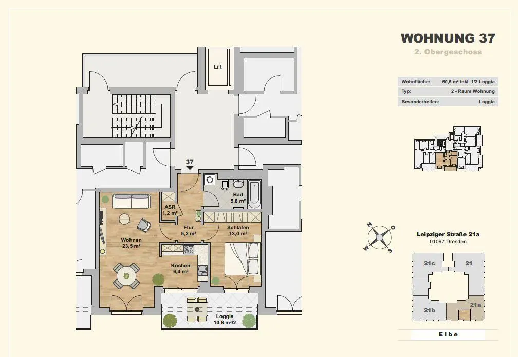 Die stilvollen Wohneinheiten haben eine Fläche von ca. 31 m² bis ca. 123 m² und besitzen einen teils unverbauten Blick auf die Elbe und den Neustädter Hafen. Hochwertige Materialien, durchdachte Grundrisse und Balkone oder Loggien an allen Wohnungen bieten eine Atmosphäre die zum Verweilen einlädt.