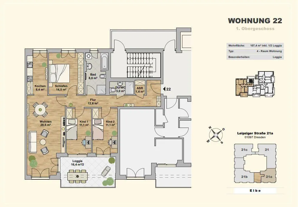 Die stilvollen Wohneinheiten haben eine Fläche von ca. 31 m² bis ca. 123 m² und besitzen einen teils unverbauten Blick auf die Elbe und den Neustädter Hafen. Hochwertige Materialien, durchdachte Grundrisse und Balkone oder Loggien an allen Wohnungen bieten eine Atmosphäre die zum Verweilen einlädt.