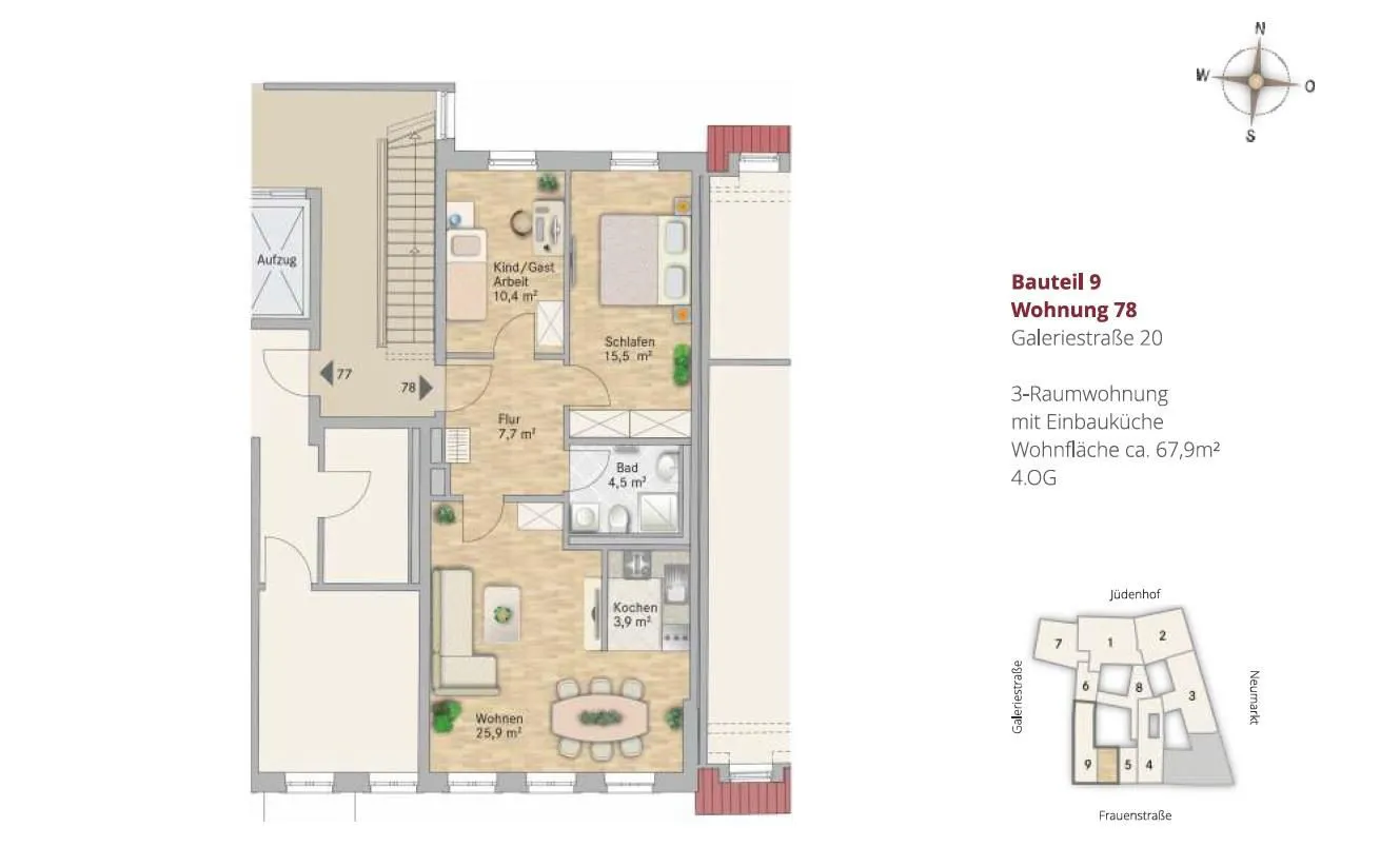 Die 4-5 stöckigen Wohn- und Geschäftshäuser bestehen aus 9 Bauteilen, die sich harmonisch ergänzen. Der Zugang erfolgt über 5 getrennte Treppenhäuser. Ein Aufzug ist selbstverständlich installiert.