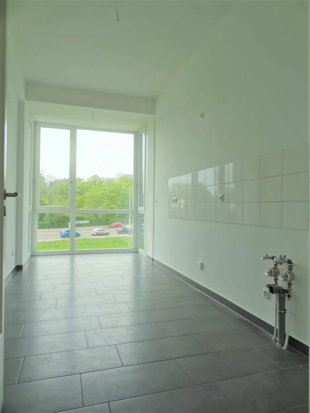 • Küche mit praktischem Fliesenspiegel im Kochbereich und Fliesenboden