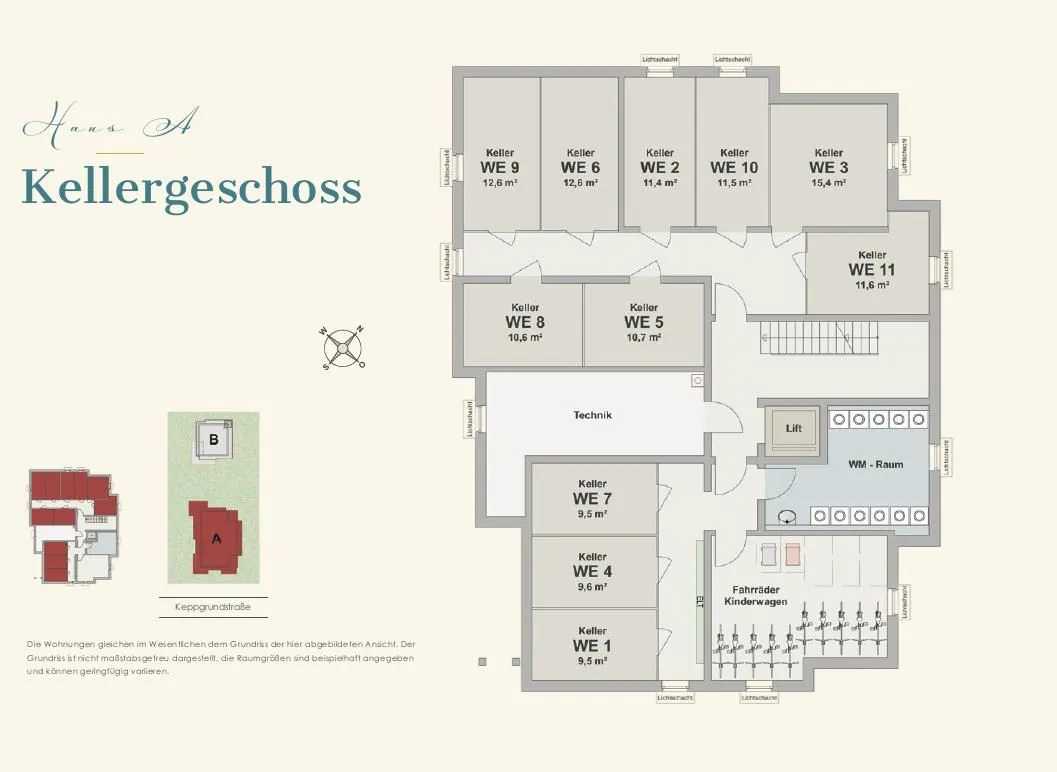 Das Grundstück verfügt über 11 PKW-Stellplätze und eine Carport Anlage mit 3 PKW-Stellplätzen. Bei der Planung des Neubaus wurde auf ausreichende Abstellmöglichkeiten geachtet. So gibt es neben den großflächigen Kellerabteilen einen Waschmaschinenraum im Keller, sowie einen Fahrradabstellraum und weitere Fahrradabstellstellflächen im Außenbereich. Jede Wohnung ist mit einem Balkon oder einer Terrasse ausgestattet.