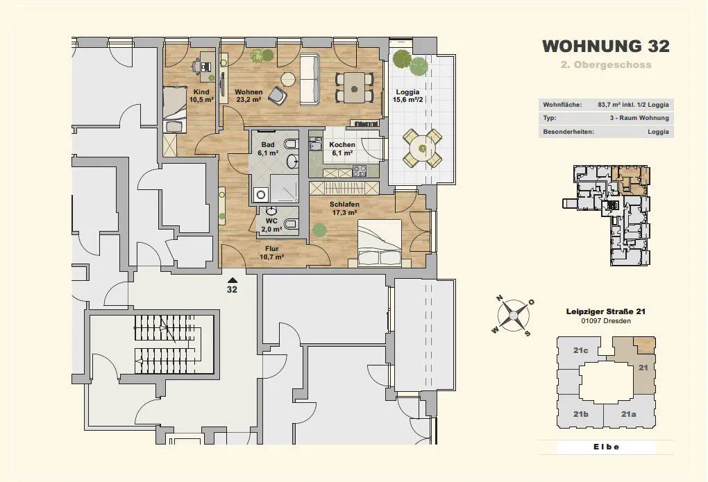 Die stilvollen Wohneinheiten haben eine Fläche von ca. 31 m² bis ca. 123 m² und besitzen einen teils unverbauten Blick auf die Elbe und den Neustädter Hafen. Hochwertige Materialien, durchdachte Grundrisse und Balkone oder Loggien an allen Wohnungen bieten eine Atmosphäre die zum Verweilen einlädt.