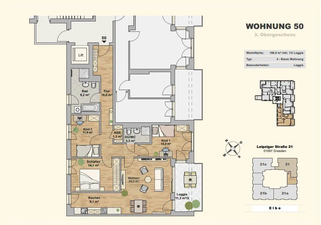 Die stilvollen Wohneinheiten haben eine Fläche von ca. 31 m² bis ca. 123 m² und besitzen einen teils unverbauten Blick auf die Elbe und den Neustädter Hafen. Hochwertige Materialien, durchdachte Grundrisse und Balkone oder Loggien an allen Wohnungen bieten eine Atmosphäre die zum Verweilen einlädt.