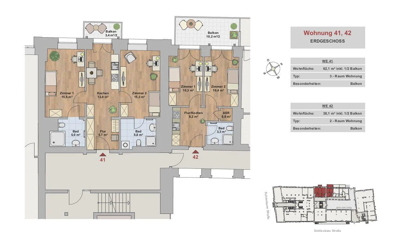 Im Objekt befindet sich eine Großzahl verschiedener Wohnungstypen.