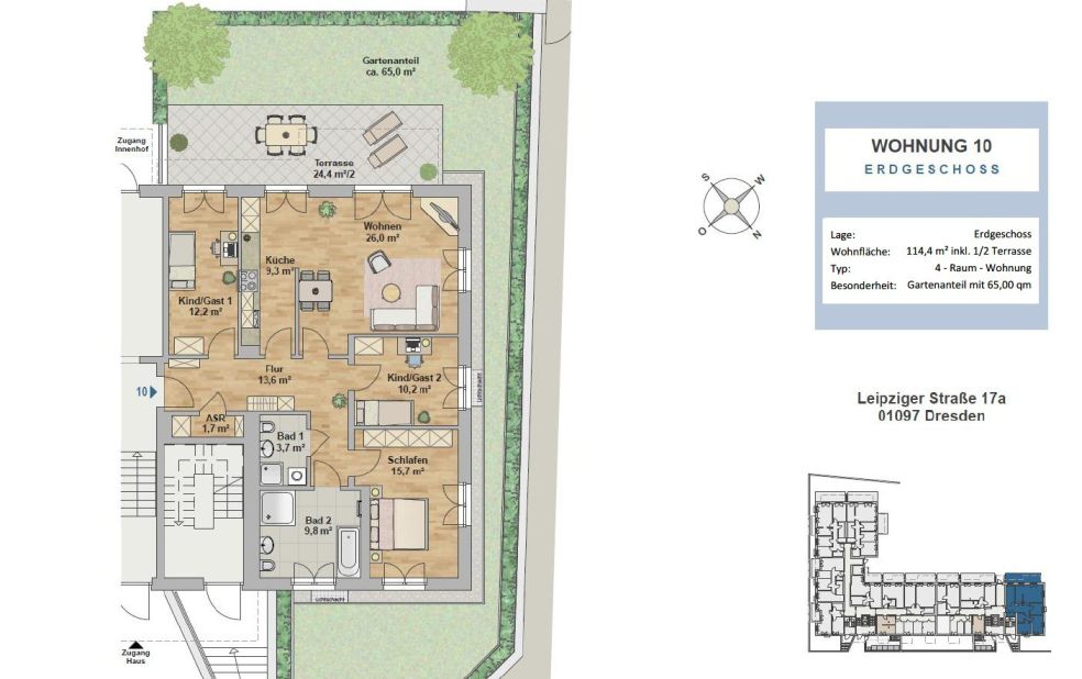 Die moderene 4-Raumwohnung befindet sich im Erdgeschoss des Hauses und wird mit großer moderner Einbauküche vermietet. Sie verfügt weiterhin über eine große Terrasse und einen anschließenden Garten, in dem Sie sonnige Stunden mit Ihrer Familie verbringen können.