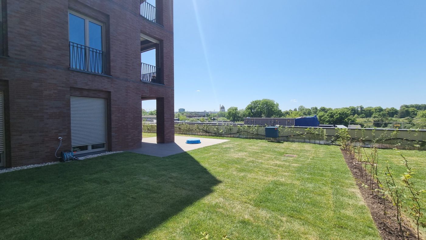 Die modernen Außenanlagen mit einem Spielplatz und Sitzgelegenheiten runden das Gesamtbild dieses Gebäudeensembles harmonisch ab.
