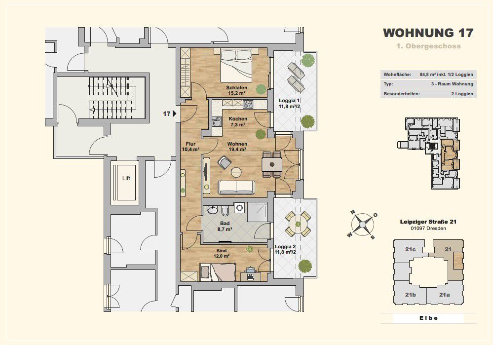 Die stilvollen Wohneinheiten haben eine Fläche von ca. 31 m² bis ca. 123 m² und besitzen einen teils unverbauten Blick auf die Elbe und den Neustädter Hafen. Hochwertige Materialien, durchdachte Grundrisse und Balkone oder Loggien an allen Wohnungen bieten eine Atmosphäre die zum Verweilen einlädt.