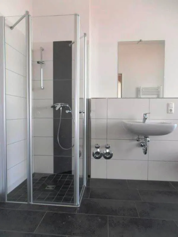 Das Tageslichtbad ist mit einer bodentiefen Dusche sowie einem Handtuchheizkörper ausgestattet. Der Waschmaschinenanschluss befindet sich ebenfalls hier.