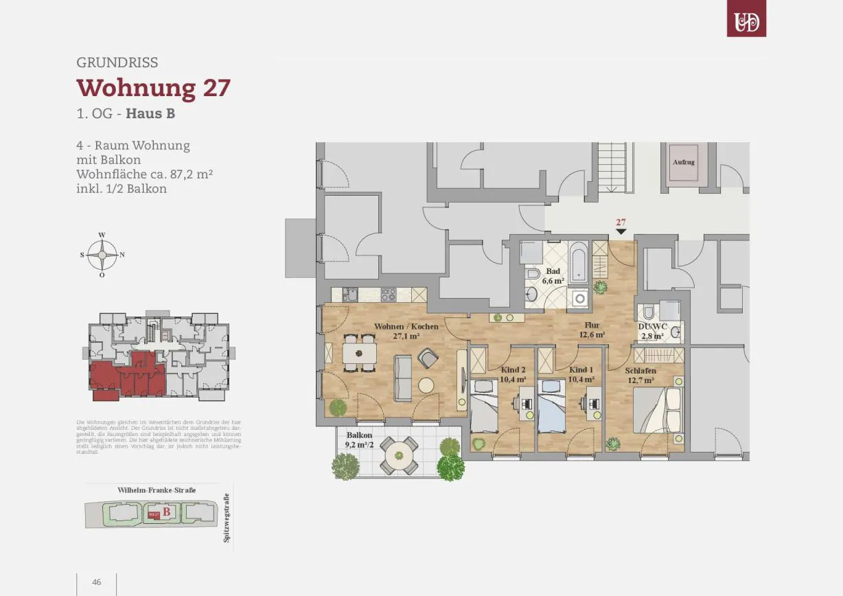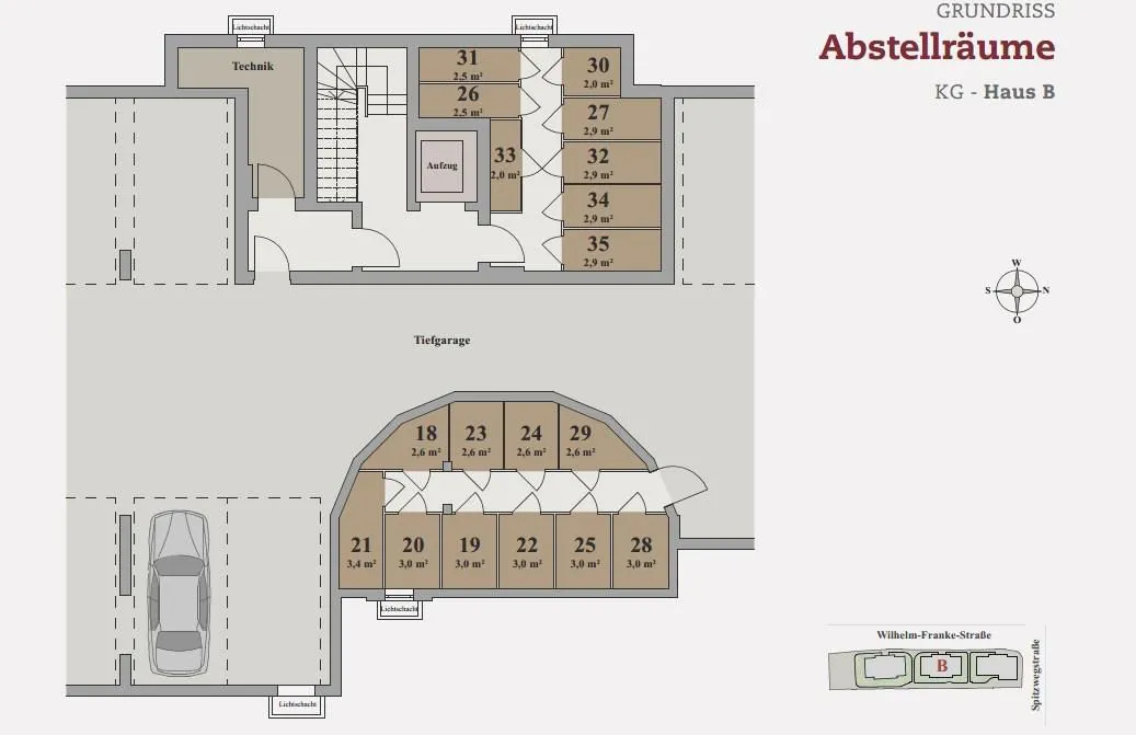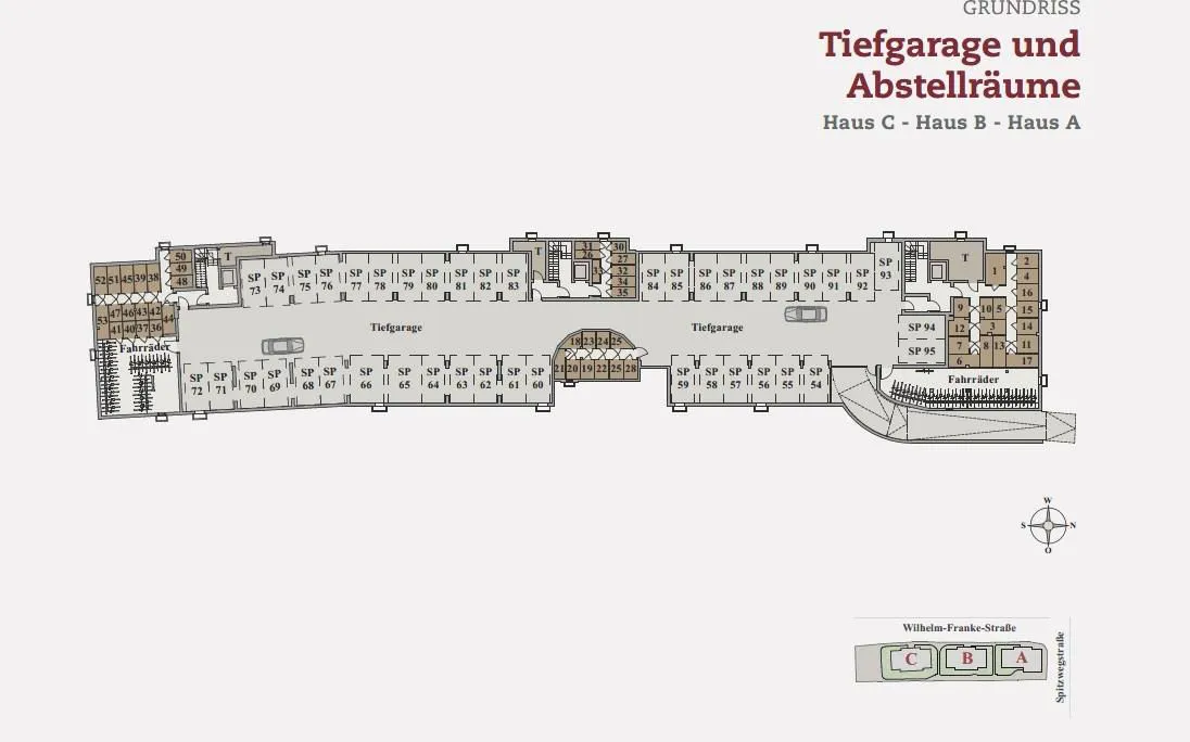 Die Tiefgarage verfügt über 42 PKW-Stellplätze und auch für ausreichend Abstellmöglichkeiten der Fahrräder ist gesorgt. Jede Wohnung ist mit einem Balkon oder einer Terrasse ausgestattet. Fast allen Erdgeschosswohnungen steht zusätzlich ein eigener Gartenanteil zur Verfügung.