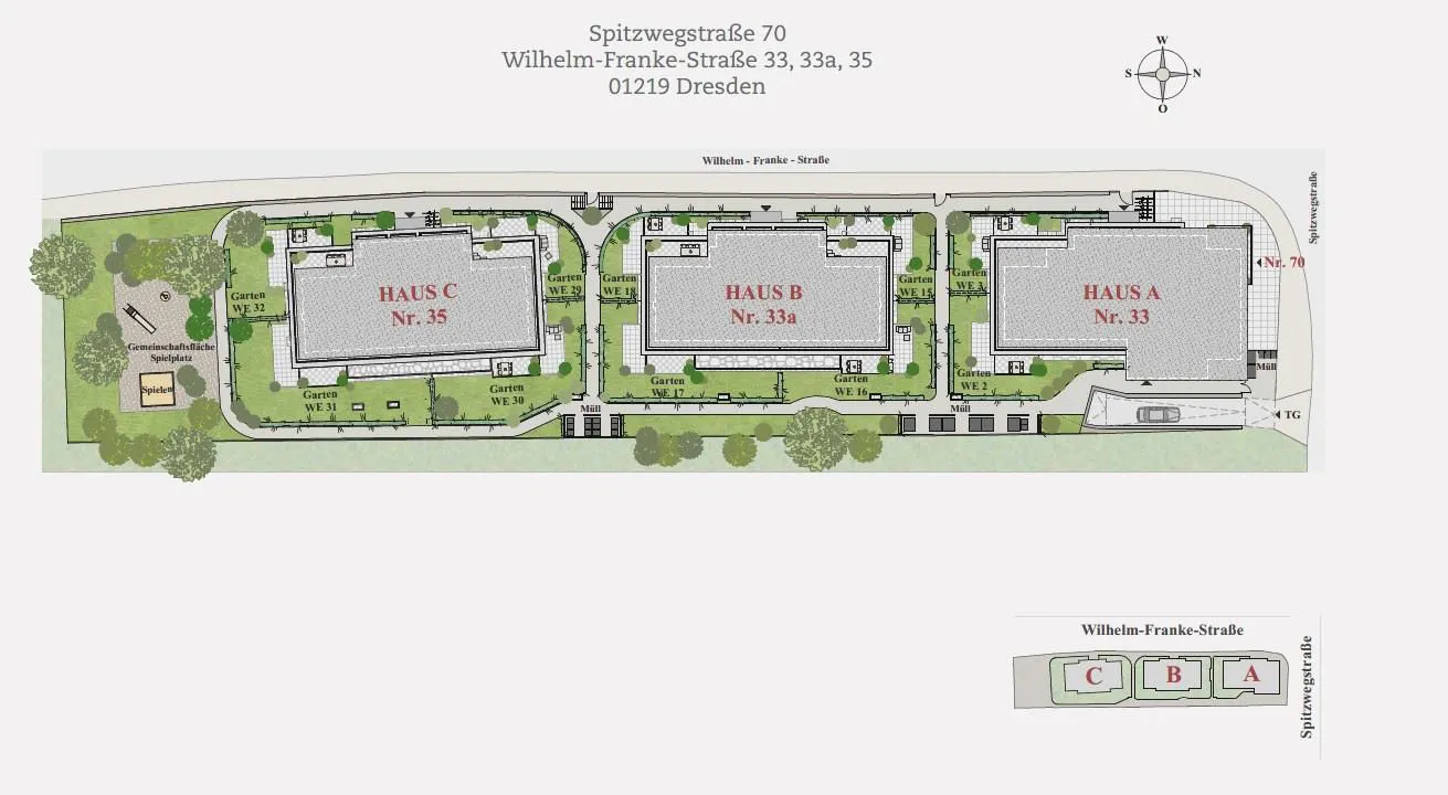 Mitten im Herzen von Dresden Leubnitz-Neuostra entstehen die Neubauvorhaben "Spitzwegstraße 70/ Wilhelm-Franke Straße 33, 33a und 35" in einer der ruhigsten Wohngegenden der sächsischen Landeshauptstadt. Auf dem ca. 3.207 m2 großen Grundstück werden drei stilvolle, sich in die Umgebung integrierende Wohnhäuser errichtet, welche sich durch ideal geschnittene 1 bis 4-Raumwohnungen mit einer Größe von ca. 22 m2 bis 113 m2 Wohnfläche und der neuesten technischen Ausstattung aus¬zeichnen.