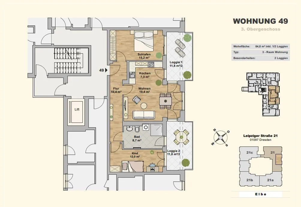 Die stilvollen Wohneinheiten haben eine Fläche von ca. 31 m² bis ca. 123 m² und besitzen einen teils unverbauten Blick auf die Elbe und den Neustädter Hafen. Hochwertige Materialien, durchdachte Grundrisse und Balkone oder Loggien an allen Wohnungen bieten eine Atmosphäre die zum Verweilen einlädt.
