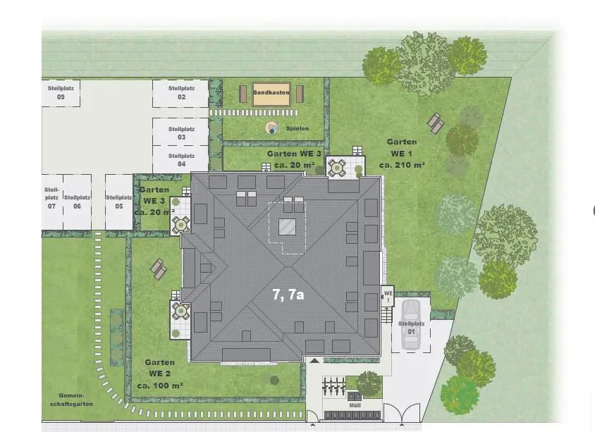 Alle Wohnungen werden über sonnige Balkone oder Loggien verfügen. Im Erdgeschoss wird zusätzlich eine großzügige Gartenfläche zur eigenen Nutzung vorhanden sein.